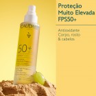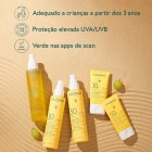 A Água Solar de Proteção Muito Elevada FPS50+ protege com eficácia rosto, corpo e cabelos, ao mesmo tempo que oferece uma ação antioxidante à pele mais sensível. A sua textura invisível, entre a água e o óleo, penetra rapidamente sem efeito oleoso e deixa na pele um suave perfume a verão. Uma fórmula clean e respeitadora do oceano, para toda a família!