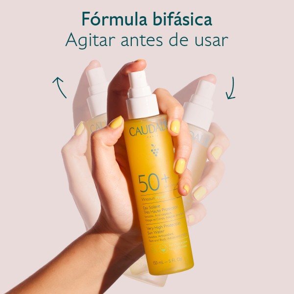 Utilize a Água Solar de Proteção Muito Elevada FPS50+ antes de cada exposição ao sol. Agite bem antes de aplicar para misturar as duas fases, depois vaporize generosamente no rosto e no corpo. Evite o contorno dos olhos.
