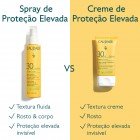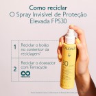 Utilize o Spray Invisível de Proteção Elevada FPS30 antes de cada exposição ao sol. Vaporize generosamente no rosto e no corpo. Evite o contorno dos olhos.